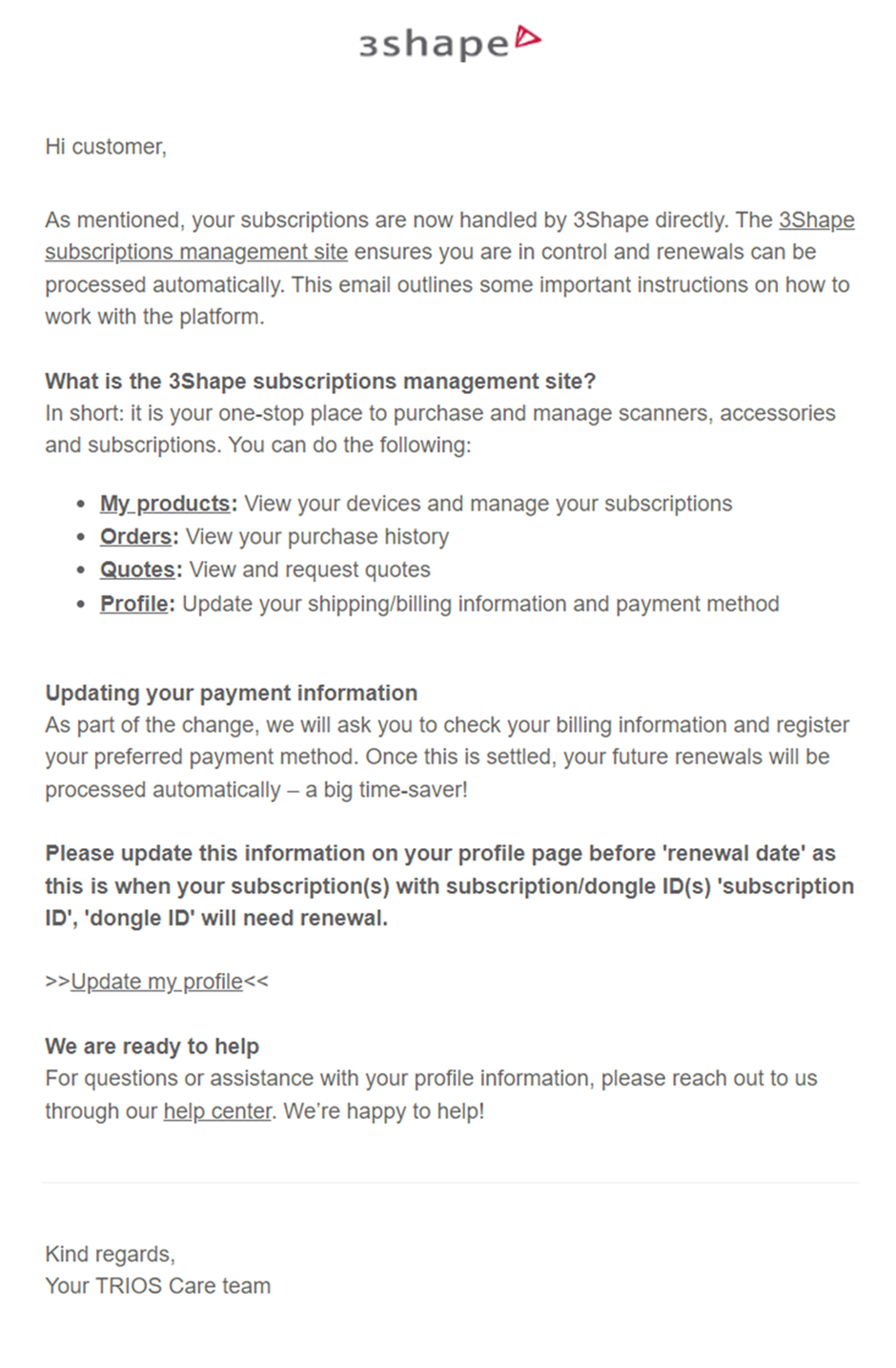 If you missed the emails, please find them below to get an understanding of how to renew your subscription directly with 3Shape on the 3Shape subscriptions management site.