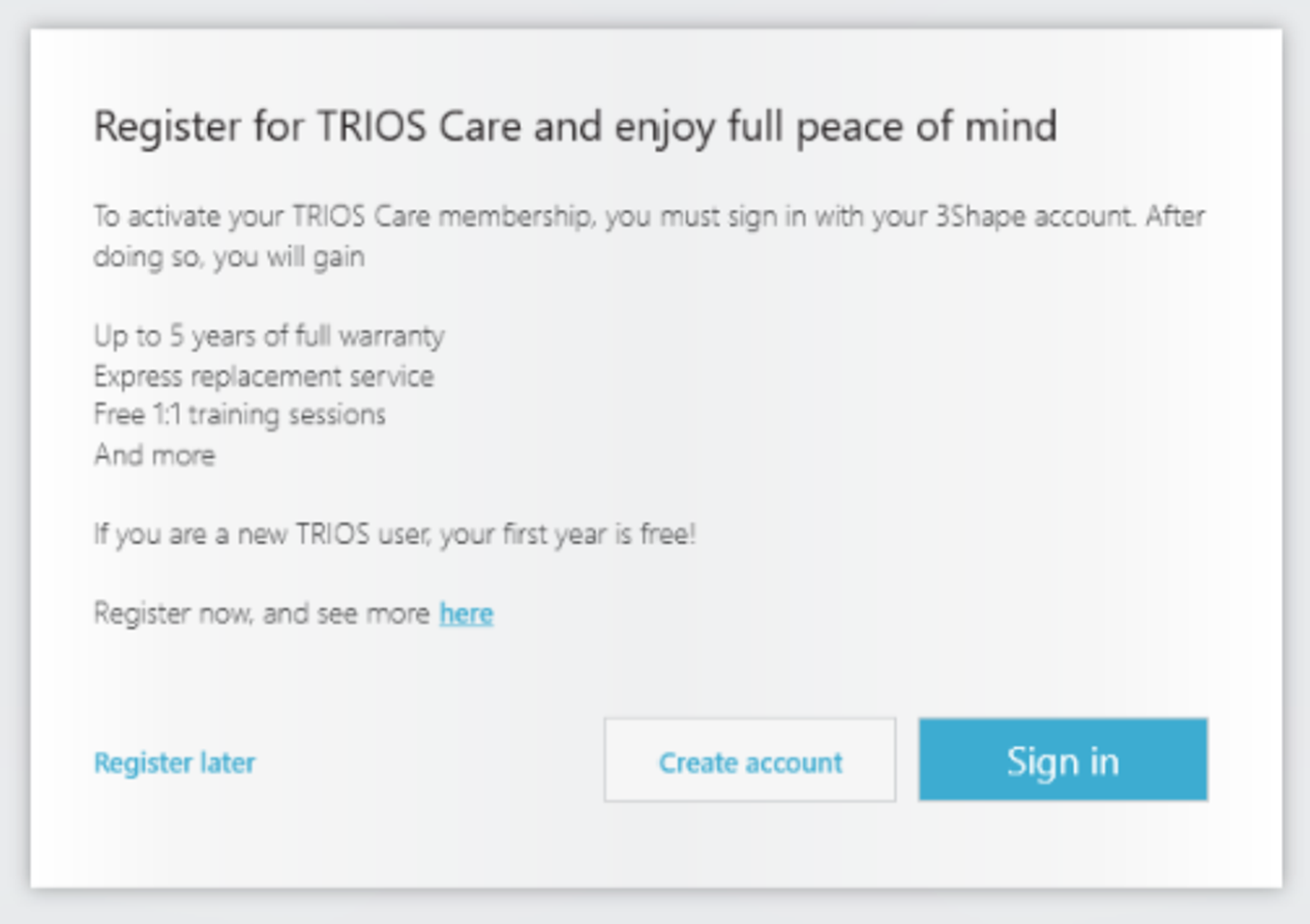 You will see a pop-up window with information about TRIOS Care. Press the Sign in button to continue or Create account button if the 3Shape ID Account was not created before.
