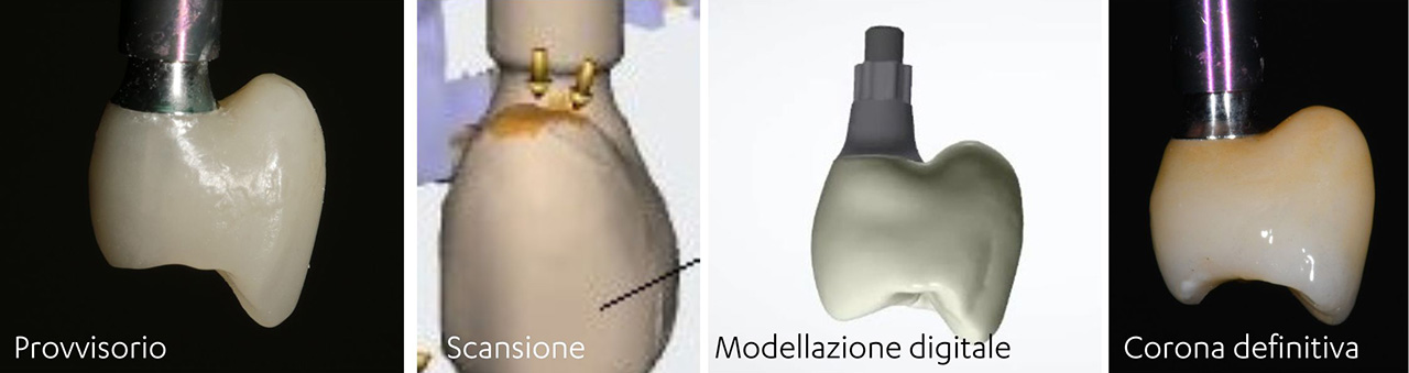 In laboratorio il tecnico riceverà la scansione dell’antagonista , la scansione della pre-preparazione che contiene il provvisorio montato sull’analogo ma posizionato esattamente come in bocca, la scansione con lo scanbody dal quale ricavare le matematiche relative a quel tipo di impianto ed inizierà a progettare il lavoro copiando esattamente le forme che abbiamo trasmesso del provvisorio condizionato.