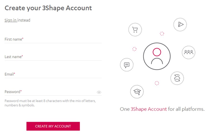 L'account 3Shape era precedentemente noto come 3Shape ID o 3Shape Communicate. Questo è il tuo account univoco che puoi utilizzare per identificarti e ottenere l'accesso alla maggior parte dei prodotti e servizi 3Shape. È necessario disporre di un account 3Shape, in quanto consente di connettersi con altri studi e laboratori e accedere alle diverse piattaforme 3Shape.