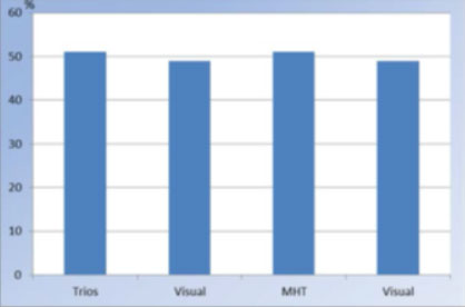 Lo studio svolto dalle università ha rilevato che entrambi i metodi oggettivi, lo strumento di rilevazione del colore della soluzione di impronte digitali TRIOS® d il sistema spettrofotometrico computerizzato SpectroShade™, sono più affidabili del sistema visivo convenzionale – l’occhio umano. Tale conclusione è conforme ad una serie di altri studi citati dagli autori dello studio svolto. 7-9, 15, 16